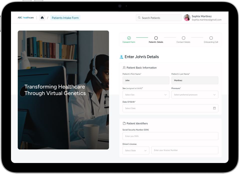 We built a single platform with role-based experiences, determined dynamically through Entra ID claims. Patients could see only their onboarding flow and transcripts, and medical assistants could see the intake status and demographics. Genetic Counselors and Clinical Geneticists could see the full clinical packet: summary, transcript, and Metriport data.