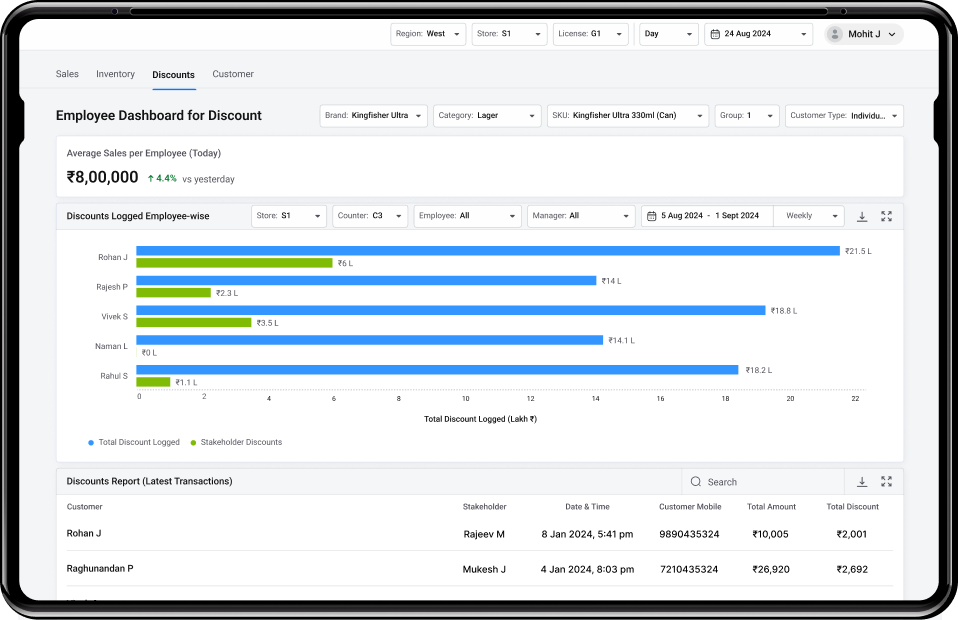 We created the discount dashboard to help the client monitor and manage discounts at the employee and store levels. It tracks employee-authorized discounts, logs discount history, and generates detailed reports on how discounts impact revenue. This dashboard ensures better compliance with discount policies, prevents misuse, and supports data-driven decisions around pricing strategies and promotional campaigns.