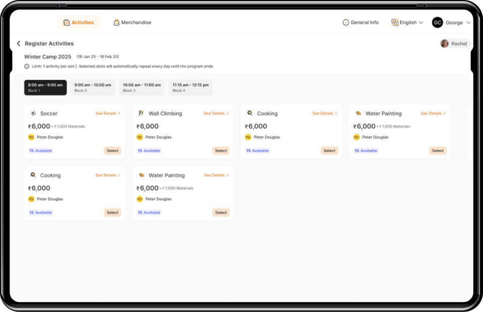 An additional Camp Program Module was built to help parents book these activities for their children during the special winter and summer camps organized by the school. This feature allowed parents to book multiple activities for their children each day, selecting different time slots based on availability. The selected activities were repeated every day throughout the camp, giving parents the ability to plan their child’s participation with ease.