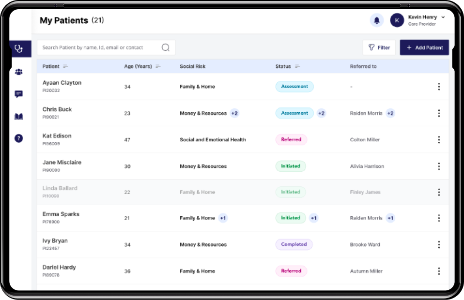 Provider’s dashboard: A user-friendly interface to view all details of patients such as patient age, social risk, status etc. Providers could also access the list of available community partners to refer patients to, through the dashboard.