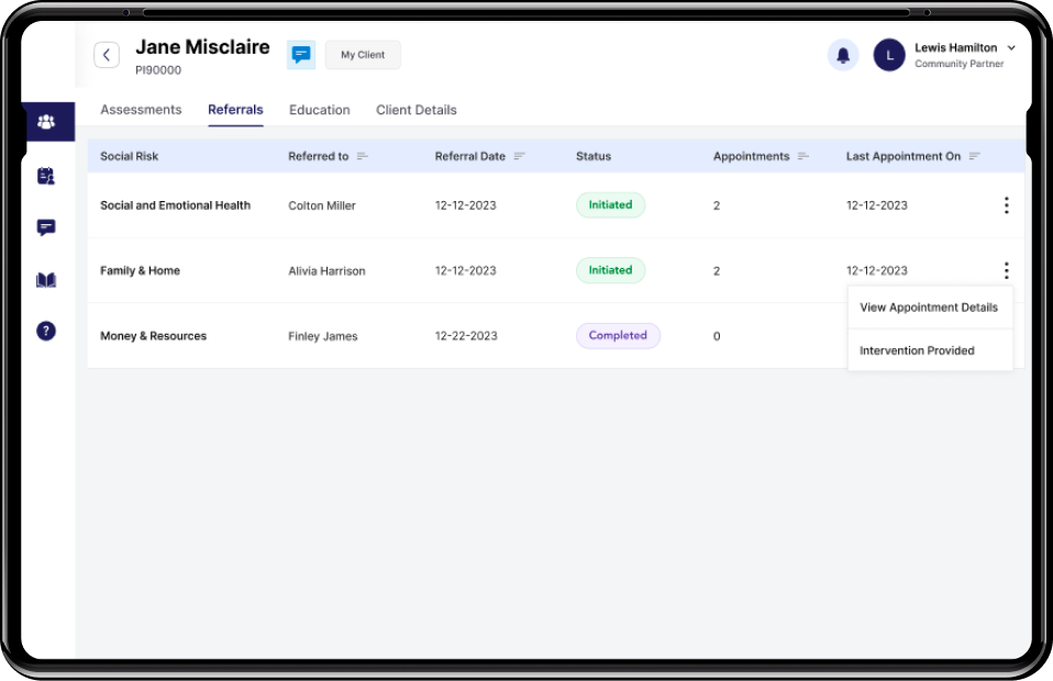 Community partner’s dashboard: Holistic view of accepted referrals, appointment schedules, resources, patient addresses, medical details, etc.