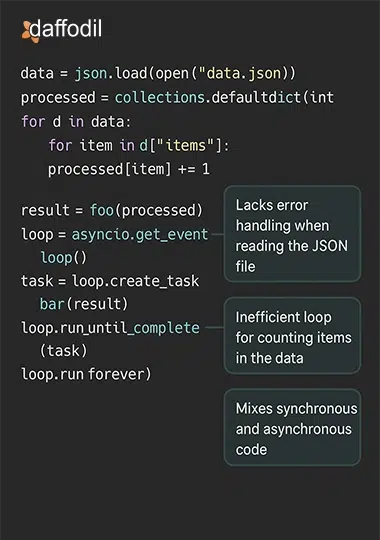 - Evaluate code organization, modularity, and adherence to best practices